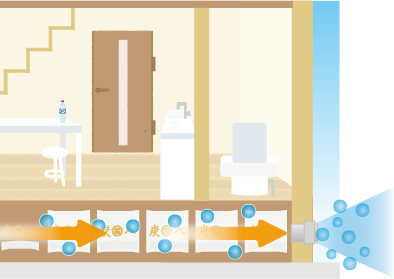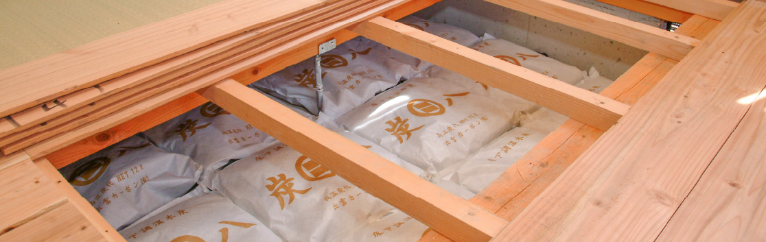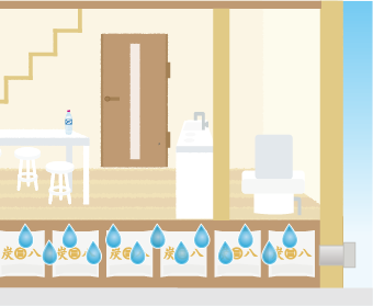 炭八に溜まった湿気は乾いた空気が床下に入った時に放湿し、屋外へ出します。常に余分な湿気を取り除くことで、家を支える木材を腐敗から守り続けます。